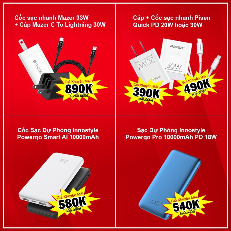 Các dòng sạc nhanh, sạc dự phòng đến từ những thương hiệu nổi tiếng, uy tín như Innostyle, Mazer, Pisen hỗ trợ sạc nhanh cho thiết bị của bạn một cách an toàn, nhanh chóng. Được bảo hành chính hãng đến 18 tháng 1 đổi 1. Chi tiết khuyến mãi mời bạn xem ngay bên dưới.