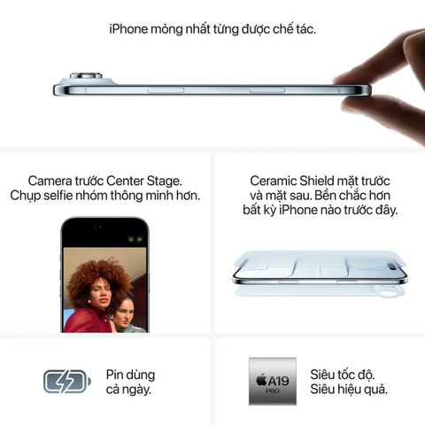 Bên trong thân máy mỏng nhẹ là sức mạnh từ chip Apple A19 Bionic, sản xuất trên tiến trình tiên tiến, mang lại hiệu năng vượt trội. iPhone Air xử lý mượt mà mọi tác vụ từ cơ bản đến đa nhiệm nặng, gaming hay chỉnh sửa video. Đi kèm là iOS 19 tối ưu, bảo mật và thân thiện với người dùng.