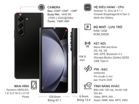 Galaxy Z Fold 5 sở hữu hệ thống camera thông số ấn tượng gồm bộ 3 camera sau 50MP, 12MP, 10MP hỗ trợ khả năng thu phóng quang học 3x & thu phóng không gian lên đến 30x giúp bạn ghi lại những bức ảnh đẹp sắc nét kể cả khi vật thể ở khoảng cách xa. Phía trước là camera 10MP và 4MP hỗ trợ chụp ảnh chân dung đẹp tự nhiên và cuốn hút.